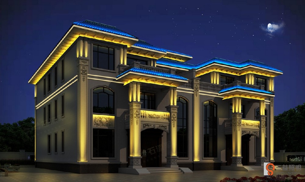 益陽市資陽區(qū)新橋河鎮(zhèn)田總別墅燈光設(shè)計項目別墅外墻燈光設(shè)計,別墅 燈光亮化設(shè)計,農(nóng)村自建房燈光工程,跟據(jù)墻體外觀特色,使用燈光勾勒出別墅造型,使鄉(xiāng)村別墅在夜間也能綻···